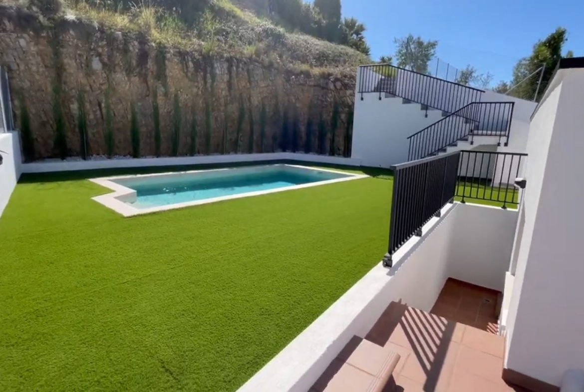 El exterior es un auténtico oasis: disfruta de su piscina privada rodeada de césped artificial, zonas ajardinadas y unas espectaculares vistas al mar que convierten cada día en un privilegio.
