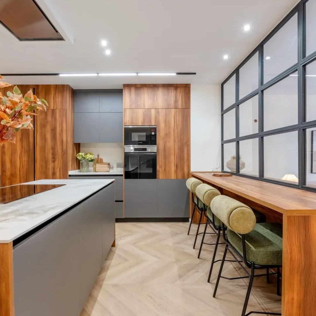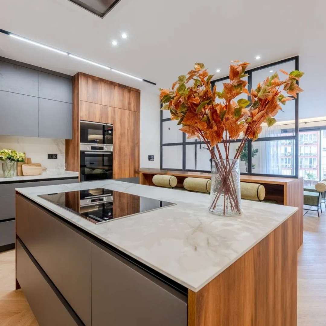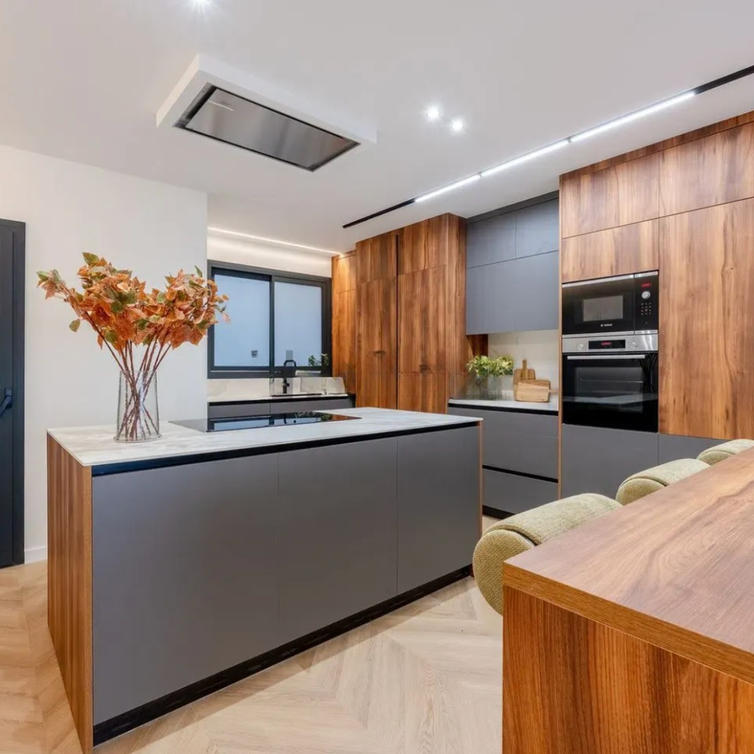 La cocina semiabierta, con acceso a un lavadero, está equipada con electrodomésticos de alta gama y diseñada con mobiliario en acabado gris mate, lo que otorga un toque contemporáneo y sofisticado al espacio. La encimera es de superficie ultra compacta Neolith, de gran formato y acabado pulido.