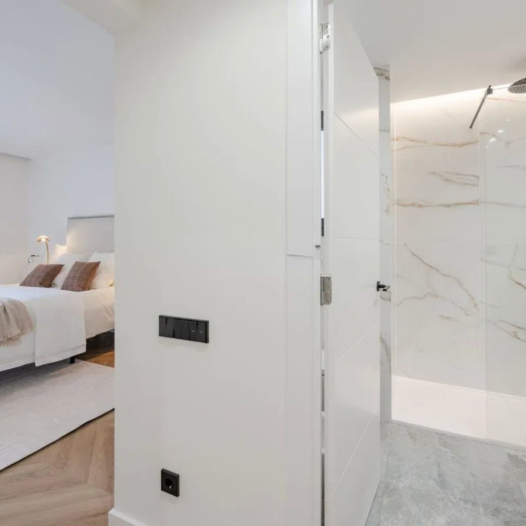 El dormitorio principal, en suite, destaca por su amplitud y luminosidad, con acceso a un balcón privado. Equipado con armarios empotrados de suelo a techo, este espacio ofrece el máximo aprovechamiento del espacio. El baño en suite cuenta con platos de ducha de diseño, sanitarios suspendidos y acabados de alta calidad, creando un ambiente relajante y cómodo para la privacidad y el descanso.