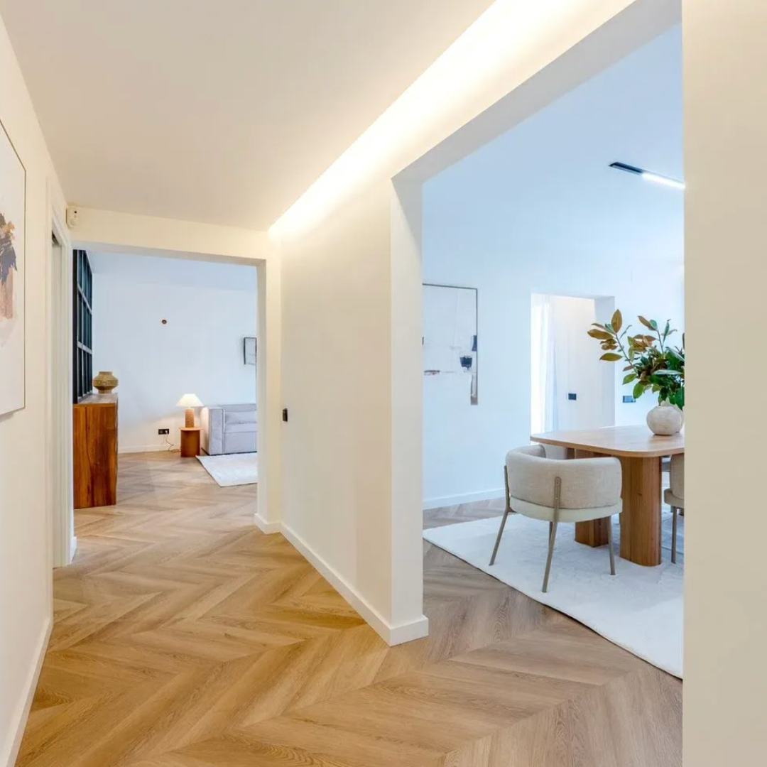– Tarima de alta resistencia en toda la vivienda, con acabado en efecto madera natural que aporta calidez y elegancia a los espacios.