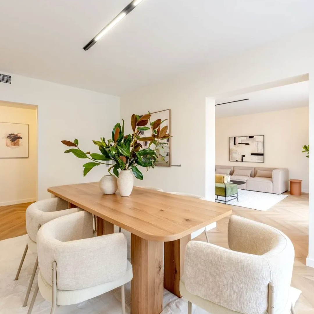 El espacio principal lo ocupa un salón-comedor luminoso, que se integra de forma natural con una amplia terraza privada. Esta zona de día es ideal para disfrutar de la luz natural y crear un ambiente relajante y acogedor.